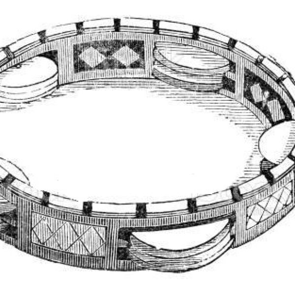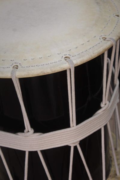 Classification Dournon : 212.11 Tambour bimembranophone à percussion directe, sur caisse, cylindrique, à peaux lacées en Y, frappé avec deux mailloches, sur pied