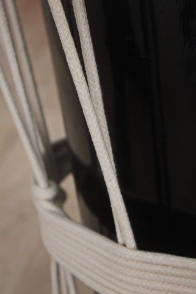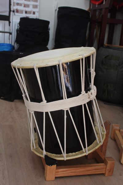 Okedo : le fut est en bois, ici avec des cordes pour tendre la peau (peut être en métal comme le Shime). Le son résonne moins que les autres, il est plus grave et sec.